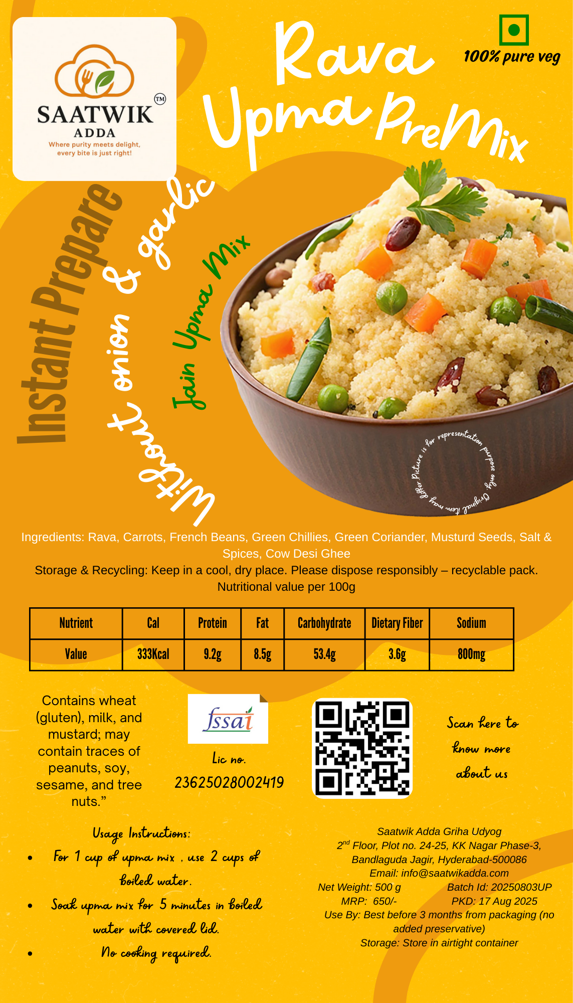 Experience the authentic taste of homemade upma in just 5 minutes with Saatwik Adda's Instant Rava Upma Premix – packed with vegetables, dal, and pure cow desi ghee for a wholesome, delicious meal anytime.